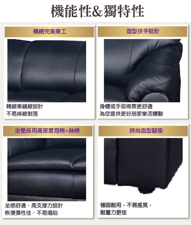 【綠活居】麥卡隆 台灣製半牛皮革獨立筒三人座沙發椅現代黑色系+現代美型設計+單人座+二人座+三人座組合等設計,就是這種頂級質感的設計,能輕鬆地融入各種空間風格,沙發採用松木實木骨架+防潮黑漆腳座等安心材質耐用堅固,搭配獨立筒彈簧座包+高密度三層式泡棉+絲棉等材質製作椅墊,座感舒適,沙發採用台製牛皮皮革材質製造,現在購買專人送到府服務,免組裝+免運費,讓你省時省力省運費! 【商品特色】 現代黑色系+現代美型設計+單人座+二人座+三人座組合等設計 松木實木骨架+防潮黑漆腳座+台製牛皮皮革等材質 椅墊內部採用獨立筒彈簧座包+高密度三層式泡棉+絲棉等安心材質製造 專人送貨到府免組裝免運費服務,讓您省時又便利